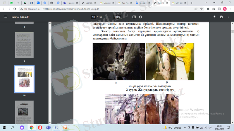 Ірі қараны электр тогымен есеңгірету. Кейбір ғалымдардың зерттеуі бойынша электр тоғымен есеңгіретудің әсерінен қан тамырлары сергектендіріліп, қанның толық шығуына жағдай туғызылады. Есенгіретудің бұл түрлерінің бәрінде де токтың әсер ету уақыты біршама . Сондықтан кейде ол қаңқа еттерінің қатты жиырылуын туғызады. Ол омыртқаның сынуына әр түрлі мүшелердің қанталауына әкеп соғады. Бұл кемістікті жою үшін токтың кернеуі - 300 В, ток күші - 2 А, жиілігі - 50 Гц болуы ұсынылады. Малға әсер ету уақыты 2-5 сек. Бұлай еткенде қанталау, сыну 2, 6 есе азаяды.
