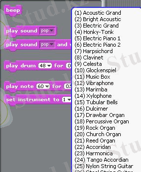 Жазбаны немесе құралды тек бар жазбалар мен құралдар тізімінен таңдауға болады. Сіз дыбыс кірпіштерінің ішіне ешбір мәнді толтыра алмайсыз. Scratch бағдарламасында әртүрлі нысандарға өзіңіздің музыкалық бөліктеріңізді қосуға болады. Осылайша музыкалық дуэт, трио, квартет, квинтет, т. б.