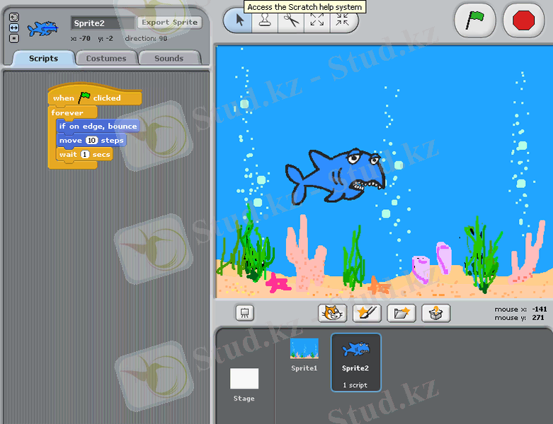 Экранда теңізде тыныш жүзетін акуланы көреміз. Мұндай суретті алу үшін қозғалыс және басқару командаларын пайдалану керек: