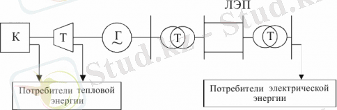 Энергия жүйесіндегі технологиялық сұлбалар: К - қазандық, Т - турбина, G - генератор, Т - трансформатор, электр желілері - электр желілері