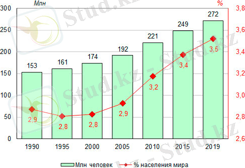 Халықаралық көшіп-қонушылардың саны (миллион адам) және олардың әлем халқының жалпы санындағы үлесі (%) ортадағы 1990, 1995, 2000, 2005, 2010, 2015 және 2019 жылдар.