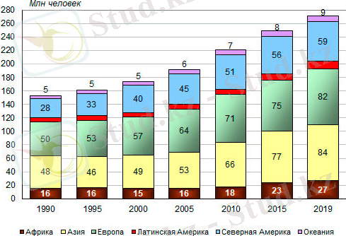 Әлемнің негізгі өңірлері бойынша ортадағы халықаралық көшіп-қонушылардың саны 1990, 1995, 2000, 2005, 2010, 2015 және 2019 жылдар, миллион адам