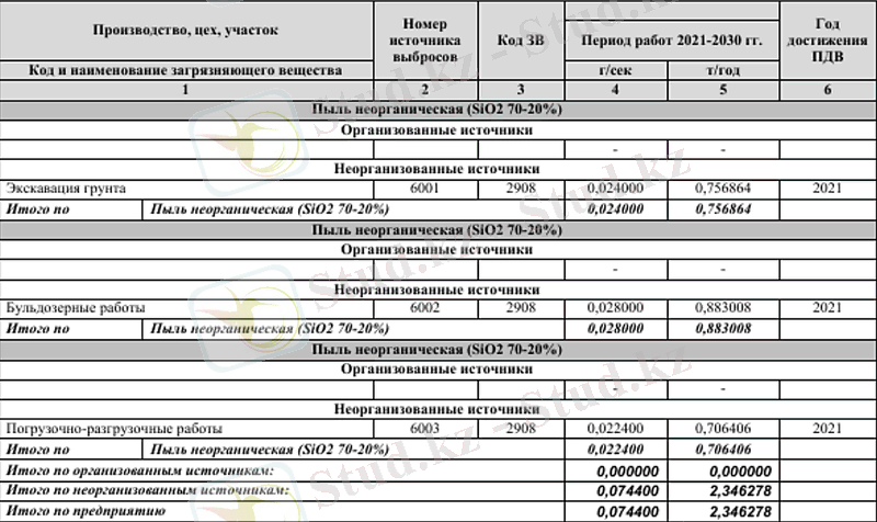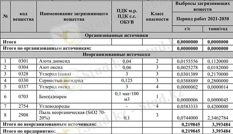 2021 жылғы Жұмыс объектісі үшін атмосфераға зиянды заттардың ШРШ нормативтерінің ұсынылатын мәндері Кестеде келтірілген.