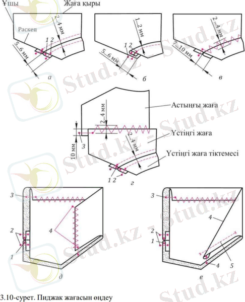 жағдайда материалдың артық жерлерін қиып тастайды. Үстіңгі жағаны қыры бойынша ішкі жағын астыңғы жағаның беткі жағына қаратып, жаға қырларының қиықтарының арасындағы арақашықтық 10 мм болатындай етіп, жапсырады. Кертпелерді сәйкестендіріп, үстіңгі жағаны қыр қиығы бойынша ені 2 . . . 4 мм ирек тігіммен бастырып тігеді (3. 10-сурет, г, 3-тігім) . Үстіңгі жағамен астыңғы жаға қырының қиығын бүктейді. Үстіңгі жағаның