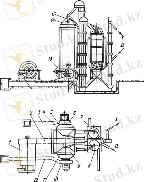 3-сурет. СЗШ-16 шахталы дән кептіргіші. 1 - от, 2 - кептіргішті жіберуге арналған ауа өткізгіш, 3, 12 - жұмсалған кептіргішті кетіруге арналған салалық құбырлар, 4, 9 - құрғақ біліктер, 5, 11 - шығатын диффузорлар, 6, 10 - желдеткіштер, 7, 8 - салқындатқыш бағандар; 13 - шығыс, 14 - артық кептіретін бункер, 15 - дренаждық гравитациялық құбыр, I - құрғақ астық, II - шикі дән