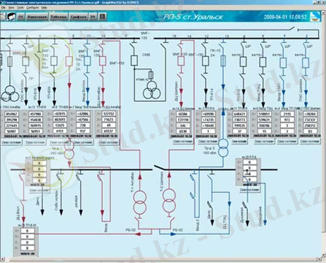 Жүйе іске қосылған кезде графикалық пішін диспетчердің мониторында пайда болады(сурет4) . Бұл GraphWorX32 пішіні, жоғарғы құралдар тақтасы «Навигация» бөліміндегі ашылмалы тізімдер арқылы әртүрлі мимикаларды жылдам және ыңғайлы шарлауға мүмкіндік береді. Мнемоникалық диаграммалар нақты таңдалған объектінің құрылымдық схемасын тікелей және кері бағыттың белсенді, реактивті энергиясын көрсете отырып, нақты байланыс нүктесіне арнап көрсетеді.
