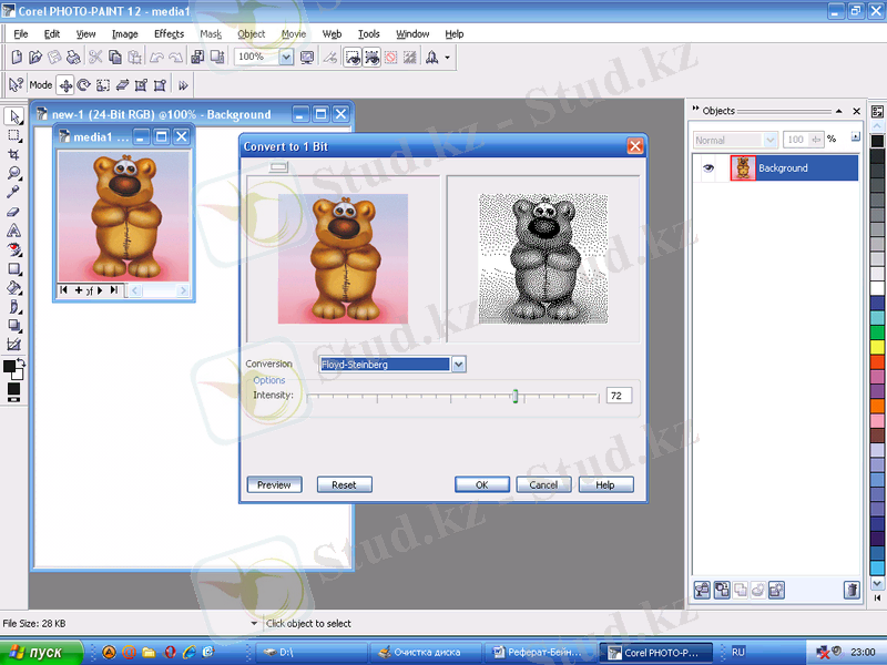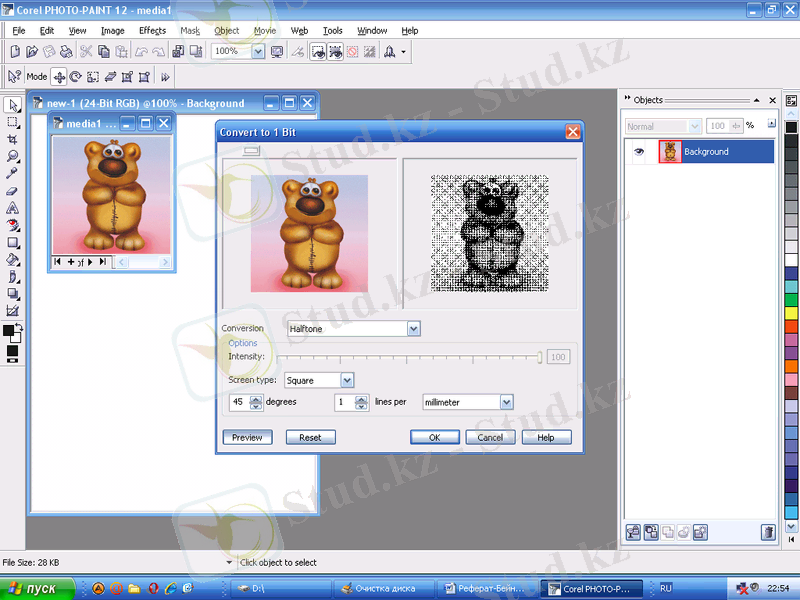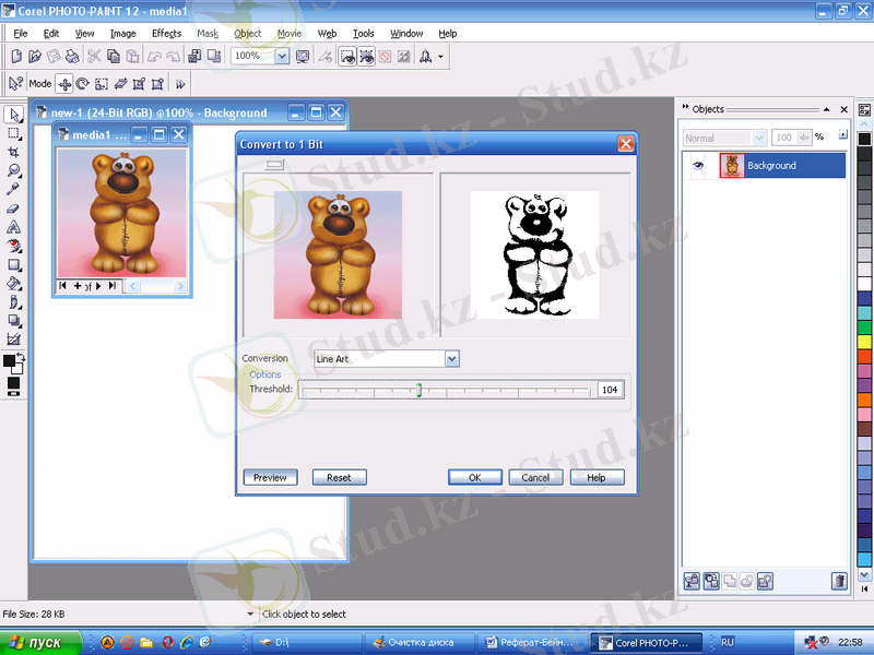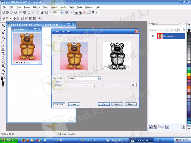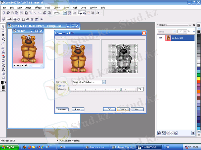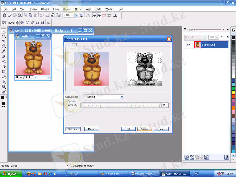 Photo-Paint бағдарламасында жартылай түсті суреттерді монохромды суретке өзгертуге болады. Ол үшін Image (Сурет) мәзірінің ішінен Color Mode (Режим) қосымшасынан Black and White (1 bit) (ақ-қара (1 бит) ) командасын таңдау керек. Бұл команда Convert to I bit (Преобразовать в 1 бит) диалогтық терезесін ашады. (1-сурет)