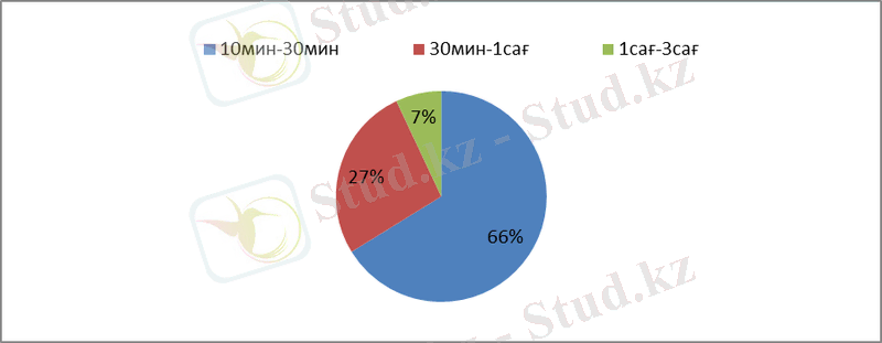 Сауалнаманың үшінші негізгі сұрағы қанша уақытыңызды блогерлерді көруге арнайсыз деген мәселеге айқындау болатын. Сауалнамаға қатысушылардың аз ғана бөлігі (7%) 1сағ-3сағ аралығында көретінін айтып кеткен. Ал, өзге (26, 8%) 30сағ-1сағ аралығында көретінін көрсетіп кетті. Бірақ, жартысынан астамы (66, 2%) блогерлерді 10мин-30мин аралықтарында қызығушылық танытып көретінін білдірді. (Кесте 3) .