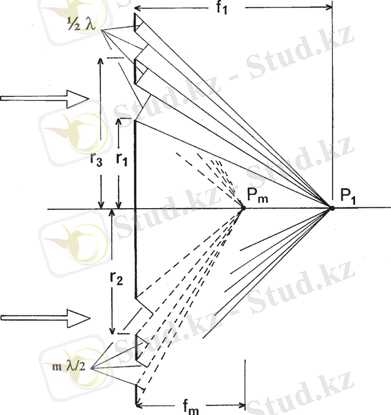 1-суретте зоналық қабатшаның бірінші сақиналарының жарық толқынмен жарықтандыруы көрсетілген. P нүктесі және зоналық қабатшаның ортасымен қашықтығы f 1 болсын, онда P нүктесі және радиустар үшін келесі теңдеу орындалады r n ( n=1, 2, 3… ) :