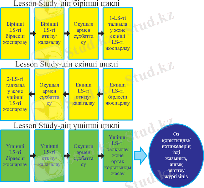 - Lesson Study-діңбасты мақсаты оқушыларға білім алуға көмектесу және топ мүшелерінің кәсіби дамуына ықпал ету болып табылатын мұғалімдердің желілік қоғамдастығы аясында іске асыруға (Dudley, P. 2011a) ;