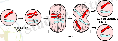Митоз - дене (соматикалық) жасушалардың бөлінуі. Митоз жасуша көбеюінің бір түрі, ол ДНК ақпаратын толық қатесіз көшіреді, жаңа жасуша тудырады. Митозтоздық бөлінуі кезінде бір диплоидты жасушадан (2n) генетикалық материалы теңдей бөлінген екі диплоидті жасуша түзілген.