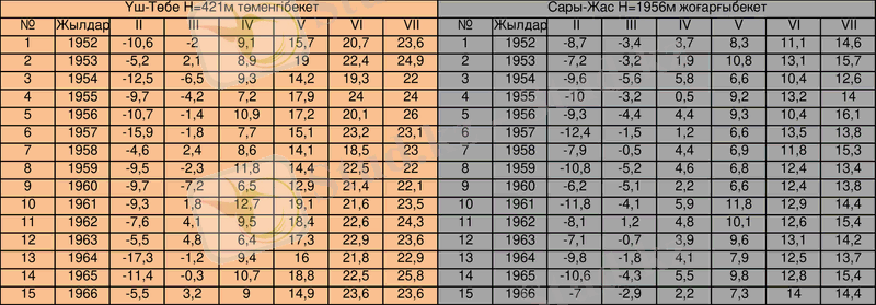 1. 1952-1966 жылдар аралығындағы теңіз деңгейінен 423 м биіктікте орналасқан Үш-Төбе және 1956м жоғары биіктікте орналасқан Сары-Жас метеостанциялары бойынша орташа айлық ауа температурасы (1-кесте) .