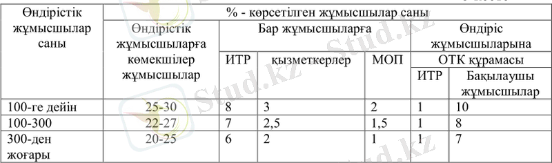 Цехтың көмекші жұмысшылар саның анықтау жоспарланған жұмыс көлемінің еңбек сыйымдылығы, жұмыс орындарының саны және қызмет көрсету нормалары бойынша және де негізгі жұмысшылар санына пайыздық қатынасы бойынша іске асырылады. Негізгі және көмекші жұмысшылардың қатынасы өндіріс түріне, шығарылатын машина түріне, технологиялық процесстің автомотизациясы деңгейіне байланысты болады. Өндіріс автоматизациясының деңгейі неғұрлым жоғары болса, көмекші жұмысшылар соғұрлым көп болады. Практика мәліметтері бойынша механикалық цехтегі көмекші жұмышылар саны негізгі жұмысшылардың санынан сериялық өндірісте 18-25%, массалық өндірісте 35-50% құрайды.