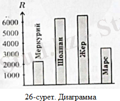 13-есеп. 26-суретте Меркурий, Шолпан, Жер және Марс ғаламшарларының радиустарын көрсететін бағанды диаграмма сызылған. Бағанды диаграмма бойынша онда берілген ғаламшарлардың ең үлкені қайсысы? Ең кішісі қайсысы?