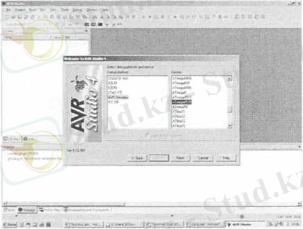 "Debug platform" пунктінде "AVR Simulator", таңдаймыз, "Device" пунктінде "ATmega8535" стендінде қолданылатын контроллер түрін таңдаймыз және кейін "Finish" пернесін басу қажетті.