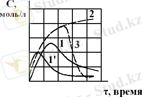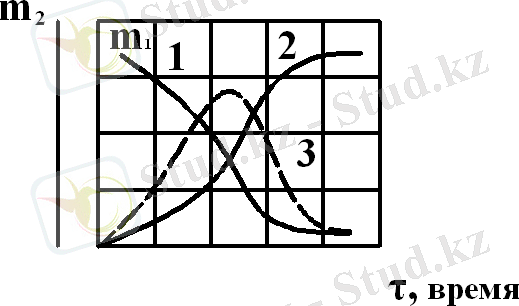 Сур. 2. 2. Типтік кинетикалық қисықтарда бастапқы заттың кемуі (1), Жаңа қосылыстың пайда болуы (2) және ерітіндідегі зат концентрациясының өзгеруі (3)
