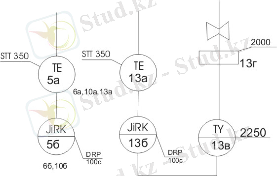 ауамен жіберетін күші бар. Кіретін сигнал 4 тен 20МА -ға дейін . Қысымы 6 барға дейін Шығушы сигнал 0, 2 ден 1 барға дейін. Жалындамайды температураны өлшеу үшін температураны жеткізуші интеллектуалды STT 350 поз. 5а, 6а, 10а, 13а құралын пайдаланамыз. Жеткізуші сериялар STT 350 моделі қызметі кең және ТДС 300/ ТРS цифрлық интеграциясы үшін қолданылады. Жеткізуші құралында қарсыласу термометрі және термометр, қашықтықтағы конфигурациялар және диапазондар үлкен спектрі, қауіпсіздік стандарты бар. Кеңейтілген мүмкіндігі, номиналды дәлдігі Рt 0, 2º С үшін 0, 1 º С ал J түріндегі термобу үшін 0, 2 ºС. альваникалық изоляциясы: 1, 4 КВ. Көрсеткіш үшін ДКР-1000 поз. 5б, 6б, 10б, 13б түрі үшін таспалы өзі жазушы қолданылады. Оның сипаттамасы жоғарыда келтірілген. 2250поз. 13в типіндегі реттеуші клапан құралдарымен реттеу жүргізіледі. 4 тен 20 МА ға дейінгі 0, 2 ден 1, 0 барға дейінгі пневматикалық сигналда электрлік сигналды ауыстырады. Ауамен жіберетін күші бар. Жалындамайды. 2900 реттеуші клапан компакті көптеген операциялары бар әмбебап. Құрылым модульдігі стандартқа сай. Корпус материалы әр түрлі: көміртекті болат, тозбайтын болат, жоғарытемпературалық тозбайтын болат. Әкелімі мембранды пневматикалық немесе электрлік.
