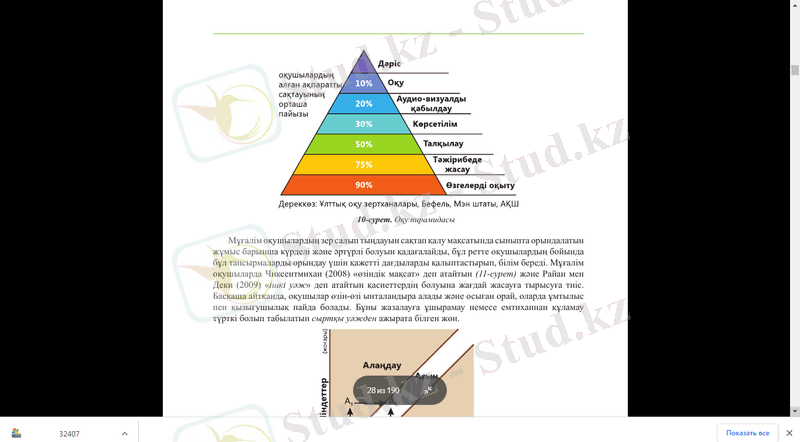 Осындай дағдыларды игере отырып қашықтықтан оқыту жағдайында «Оқу пирамидасы» бойынша оқушы алған ақпаратты 30%-ға дейін есте сақтайтындай сабақтар ұйымдастырып өткіздім.