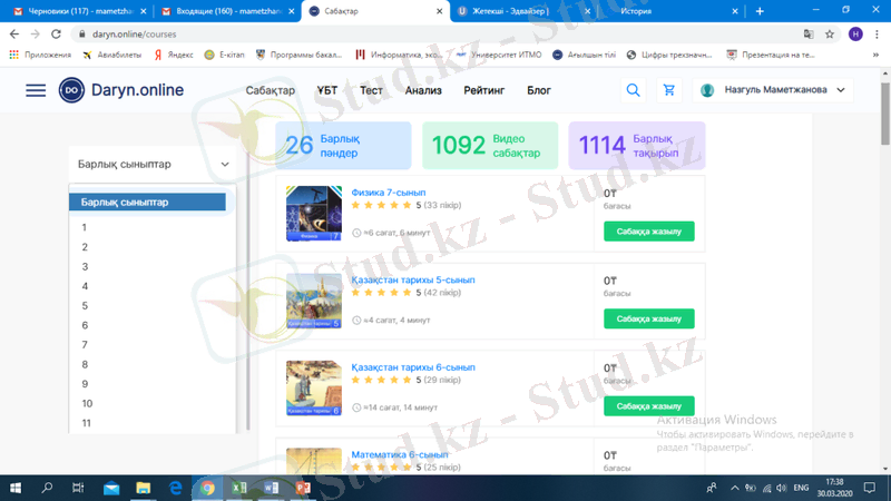 - Daryn. online -Еліміздегі жастар ресурсын әлеуметтік жағдайы мен қашыққа қарамай сапалы біліммен қамтамасыз ететін платформа (1-сурет) . Ата-ана баласына қосымша сапалы білім алу үшін оқытушы-репетитор немесе білім беретін орталықтар іздеп уақыттарын жоғалтпайды. Платформамен жұмыс жасау үшін балаға интернет желісі және компьютер болса жеткілікті. Еліміздегі білікті ұстаздардан тәулік бойы білім алуға мүмкіндік жасалған. Яғни, ата-ана баласына тәжірибелі, білікті ұстаздардан онлайн білім алуға жағдай жасай алады.