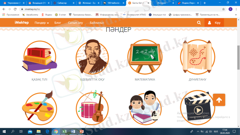 - IMektep бастауыш мектеп бағдарламасы- қазіргі заманауи технологиялар мен білім беруді ұштастыру арқылы ұстазға бен балаға тиімді көмекші құрал. Платформада бастауыш мектеп бағдарламасын толықтай қамтитын танымдық анимациялық сабақтар мен оны бекітуге көмектесетін жүздеген ойын түріндегі тапсырмалары бар. Бұл оқыту кешені бастауыш мектеп бағдарламасында оқытылатын негізгі 8 пән бойынша (2-сурет) толықтай анимацияланған сабақ үлгілерін ұсынатын, 170-тен аса тақырып қамтылған. Курстар интуитивті іздеу жүйесі мен ыңғайлы фунцияланған классификациялау жүйесі бар онлайн платформа негізінде жұмыс жасайды. iMektep-ке тіркелген аккаунтпен BilimLand және iTestсайттарын да пайдалана алады.
