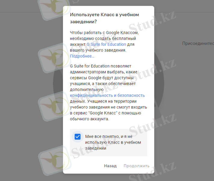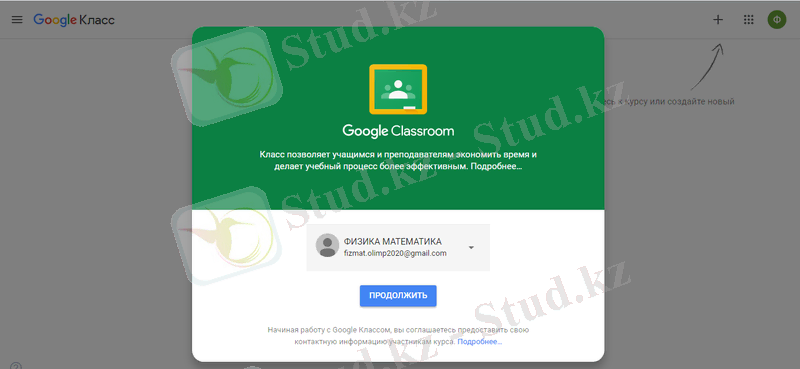 11-сурет. Алғашқы Google Classroom терезесі. «Жалғастыру» батырмасын басу арқылы келесіге өту.