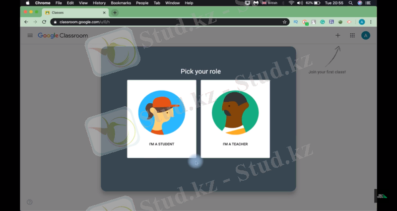Аталған веб-сервисті ашу. Кез-келген браузердің мекен-жай қатарына Classroom. google. com теріп немесе https://edu. google. com/products/classroom/?modal_active=none сілтемесі арқылы өтуге болады (google chrome браузерін кеңес береміз) . Егер Сізде Gmаil. cоm электронды почта болса онда сол почта арқылы кіруге болады, жоқ болған жағдайда жаңа аккаунт ашу қажет (5-сурет) .
