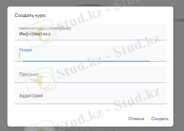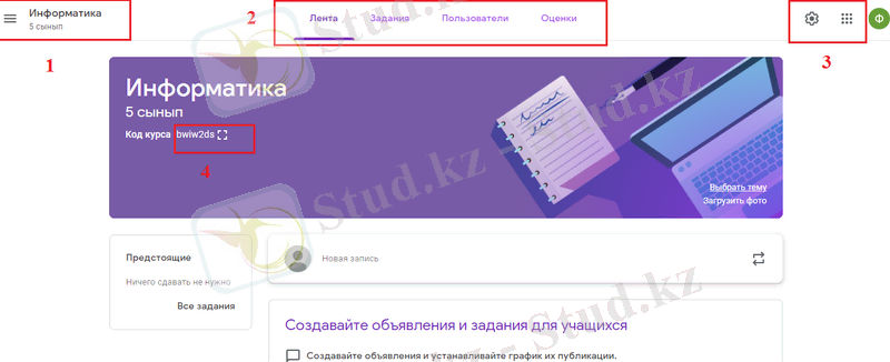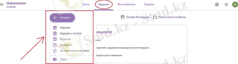 Тіркелген соң, пәннің коды білім алушыларға жіберіледі. Білім алушы пәннің кодын жазып, сол пәнге тіркеледі. Білім алушының Google Classroom терезесінен «Присоединиться» батырмасы арқылы Оқытушы пәніне қосыла алады. Сондай-ақ, оқытушы тапсырма түрлеріне қарай жаңа тапсырма құруына болады (16-сурет) .