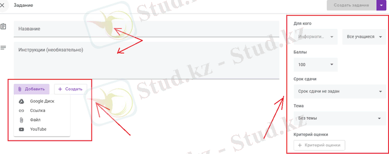 Тапсырма құруда қосымша файлдарды 17-суреттегі түрлері бойынша жүктеуге болады. Сонымен қатар, тапсырма Кім үшін жасалып жатқанын бақылап отыра алады. Ол үшін алдын-ала оқытушы барлық қатысушыларды тіркейді. Тапсырма бойынша бағалау критеийлері де қарастырылған.