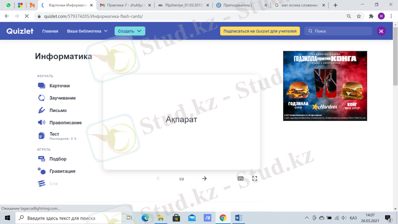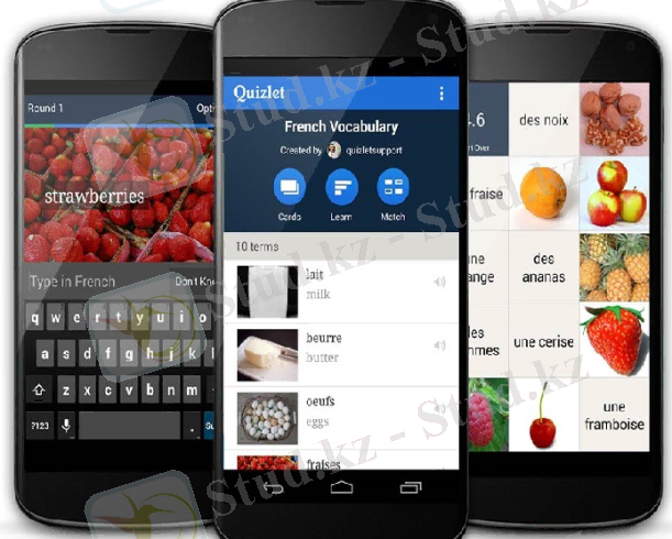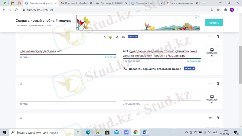 - QUIZLET(https://quizlet. com/) - тест жасауға арналған веб-сервис, онда оқушылар ұсынылған жауаптардан дұрыс жауаптарды таңдайды (87-сурет), суреттер мен ақпаратты салыстырады немесе өз нұсқаларын енгізеді. Бұл веб-сервисті пайдалану өте оңай-интерфейсті бірнеше минут ішінде түсінуге болады, сонымен қатар Quizlet орыс тілін қолдайды және Android Және iOS-та жұмыс істейді.
