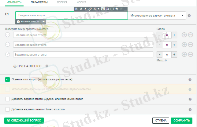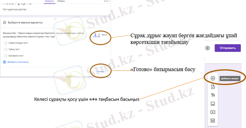 101-суреттегі терезеде құрастырушы тест сұрағын, жауап нұсқаларын, дұрыс жауап нұсқасын, сәйкесінше дұрыс жауапқа ұпай көрсеткішін тағайындайды. Тест сұрақтары толық енгізіліп болған соң, тест сұрағын сақтап, келесі тест сұрағын енгізуге көшеді. Барлық тест сұрақтары енгізіліп болған соң, «Готово» командасын таңдау керек.