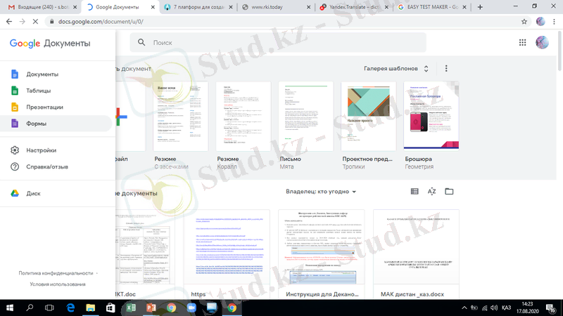 - Google формалары -тест тапсырмаларын әзірлеуге арналған Google Drive кеңсе құралдарының бірі. Алынған тест тапсырмаларын студенттерге электрондық пошта арқылы жіберуге немесе арнайы код арқылы веб-сайтқа енгізуге болады. Жұмысты тездету үшін flubaroo плагинін қосуды ұсынамыз - ол студенттердің жауаптарын автоматты түрде тексереді және берілген өлшемдерге сәйкес баға береді. Google формадағы нысандар толығымен тегін-ресурсты пайдалану үшін тек Google есептік жазбасы болуы керек (105-сурет) .