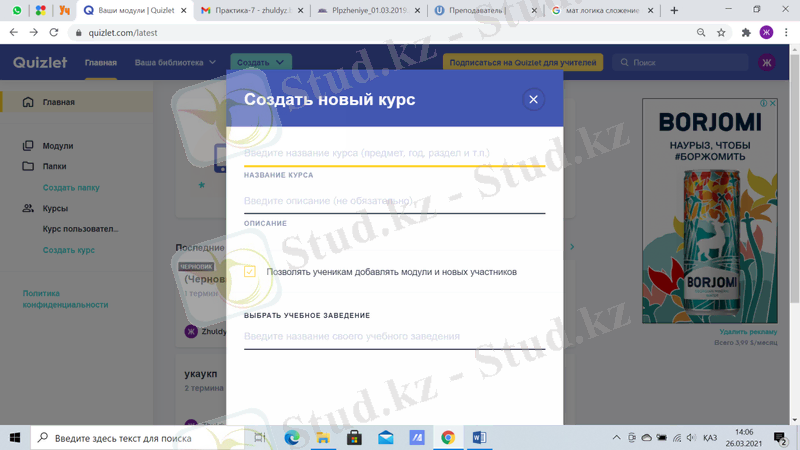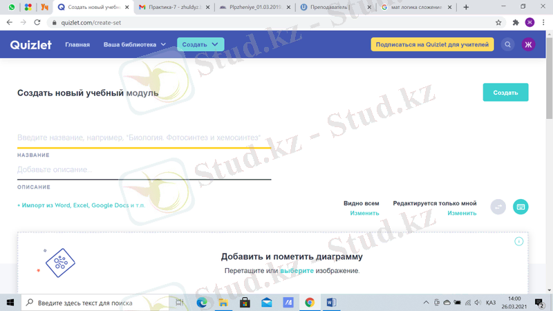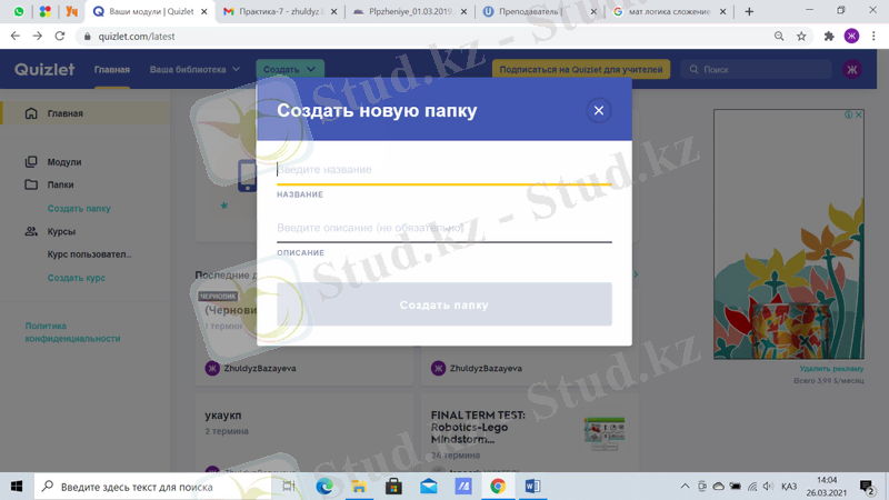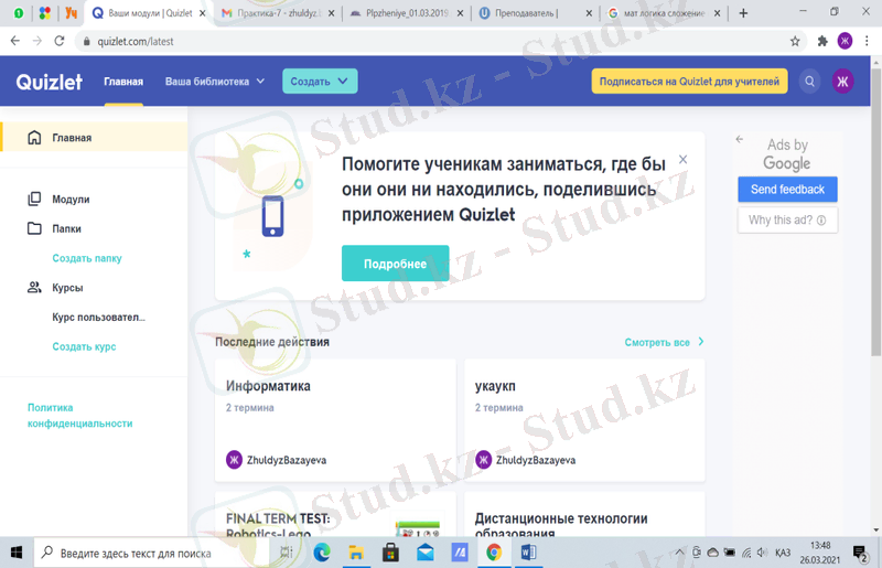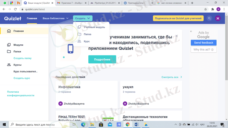 Quizlet веб-сервисінің басты терезесінің сол жағында модульдер, бумалар және курстар құруға арналған терезе орналасқан. «Последние действия» жолында соңғы құрылған тапсырмалар, модульдер немесе курстар көрінеді. Тапсырма құру үшін басты терезенің жоғары бөлімінде орналасқан «Создать» батырмасын басу керек (89-сурет) . «Создать» батырмасын басқаннан кейін не құру керек туралы сұрақ туындайды. «Учебный модуль» тапсырма құрады (90-сурет) .