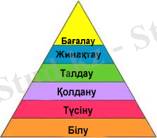 Блум танымдық салада алты деңгейді бөлді, ол ең төменгі деңгей ретінде фактілерді қарапайым қабылдау мен танудан бастап анағұрлым күрделі және абстрактілі психикалық деңгейлерге қарай жылжи отырып, ең күрделісі бағалау деп жіктеді.