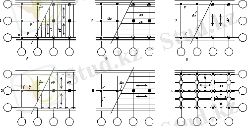 А-толық; Б - толық емес; В - регельсіз каркаспен; 1 - ригельдердің бойлық орналасуымен толық каркас; 2-сол, көлденең; 3-баған ригельдерінің бойлық орналасуымен (тек сыртқы қабырғаларда) және үлкен аралықты жабулармен толық каркас; 4-толық емес бойлық каркас; 5 - сол, көлденең; 6 - ригельсіз қаңқа; к - баған; Р - ригель; Дж - тік қаттылық диафрагмасы; НП - жабын төсемі, НР-төсем - кергіш; I - салмақ түсетін қабырғалар; II-салмақ түсірмейтін қабырғалар.