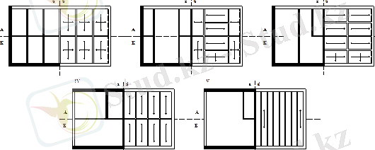 I-айқас-қабырғалық; II және III-көлденең-қабырғалық; IV және V - бойлық-қабырғалық; а - салмақ түсірмейтін немесе өздігінен салмақ түсіретін бойлық сыртқы қабырғалары бар нұсқалар; Б - жүк көтергіштері бар нұсқалар; а - қабырғалардың жоспары; б - жабындардың жоспары.