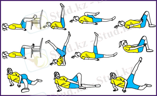 2. Біз сол қалпында қаламыз, қолдарымызды екі жағына созамыз, аяқтарын жауып, еденге дұрыс бұрышта көтереміз. Содан кейін біз баяу және мүмкіндігінше аяғымызды ашамыз, біз жердің жоғарғы бөлігін еденнен жыртып алмаймыз. Осыдан кейін, аяғыңызды баяу кесіп өтіңіз, сосын оны жабамыз. Барлық қозғалыстарды 10 рет қайталаймыз.