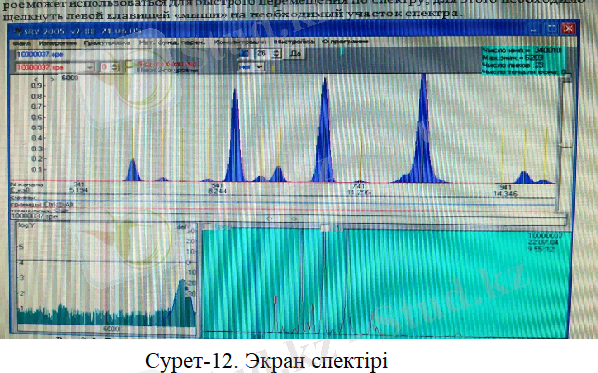 Процессті бастағаннан кейін, спектрдін суретті экранда көрсетіледі. Экранның ортасында, спектрі өзі болады. Импульстік сегментінде арналар саны осы бөлігінде арналар мен кэВ энергия саны ретінде анықталады. Экранның сол жағында бір жылжыту пернесі спектрін барынша азайту болып табылады . Терезенің төменгі сол жақ бұрышында логарифмдік спектрі бар. Толық спектрін көрсететін терезесі оң жағында орналасқан. Бұл тінтуірдің сол жақ түймешігі спектрін қажетті ауқымын жылжытуға мүмкіндік береді.