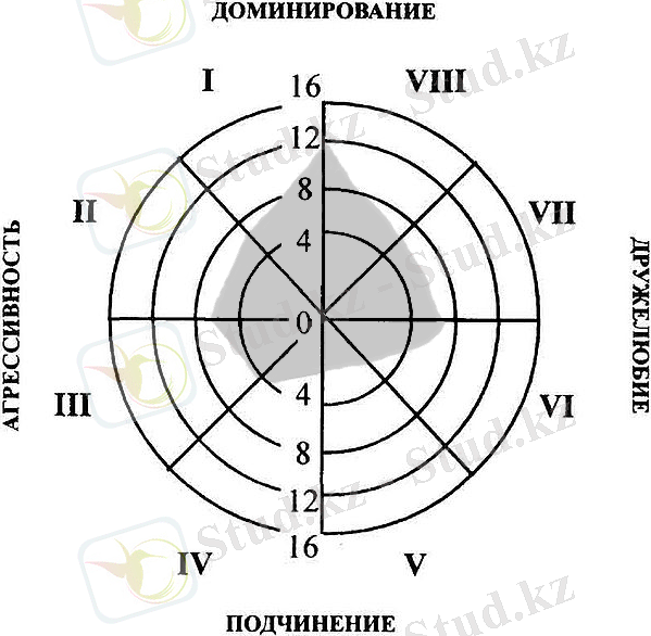 Сонымен, тест нәтижесі диаграммада көлеңкеленген бөлік түрінде ұсынылған. Бұл осы тест бойынша Субъектінің жеке профилі. Келесі формулалар екі негізгі факторға сәйкес есептеледі: "үстемдік " және"достық".
