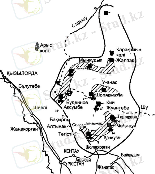2-сурет. Оңтүстік Қазақстандағы уран кеніштерінің кенорындарының орналасу картасы