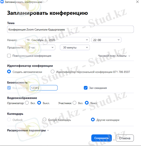 23. Конференцияны өзіңізге ыңғайлы уақытқа жоспарлау керек, сосын «Сохранить» батырмасын басып сақтаймыз.