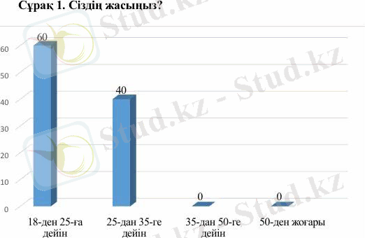 «Сіздің жасыңыз?» деген бірінші сұрақ бойынша барлық 30 респонденттің 18-і (60%) 18-ден 25-ке дейін, 12-і (40%) 25-тен 35-ке дейін деп жауап берді. Ал 35-тен 50-ге дейін және 50-ден жоғары жас аралығында қатысушылар жоқ екенін көрсетті.