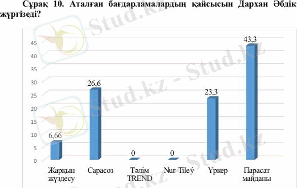 «Аталған бағдарламалардың қайсысын Дархан Әбдік жүргізеді?» деген сұраққа 2 адам (6, 66%) «Жарқын жүздесу», 8 адам (26, 6%) «Сарасөз», 7 адам (23, 3%) «Үркер», 13 адам (43, 3%) «Парасат майданы» деп жауап берді. Ал бірде біреуі «Тәлім TREND» пен «Nur Tileý» бағдарламаларын белгілеген жоқ.