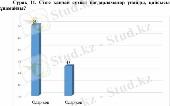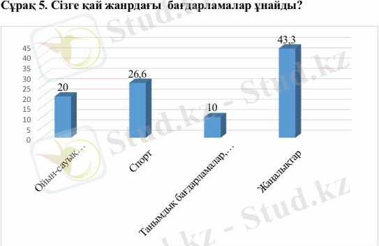 «Сізге қай жанрдағы бағдарламалар ұнайды?» деген сұраққа 6 адам (20%) «Ойын-сауық бағдарламалары (әзіл, шоу, музыкалық, сериалдар) », 8 адам (26, 6%) «Спорт», 3 адам (10%) «Танымдық бағдарламалар, танымал ғылыми бағдарламалар», 13 адам (43, 3%) «Жаңалықтар» деп жауап берді