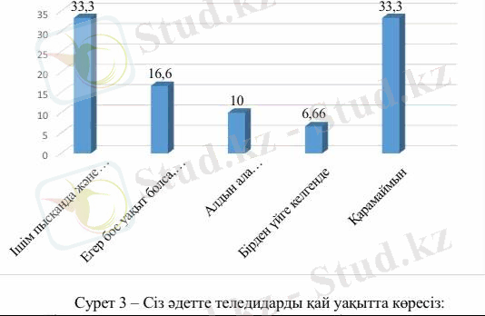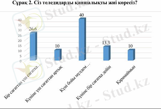 «Сіз теледидарды қаншалықты жиі көресіз?» деген сұраққа 8 адам (26, 6%) «бір сағаттан үш сағатқа дейін», 3 адам (10%) «күніне үш сағаттан артық», 12 адам (40%) «Күні бойы мүлдем қосылмайтын кездер болады», 4 адам (13, 3%) «Күніне бір сағатқа дейін», 3 адам (10%) «Қарамаймын» деп жауап берді.