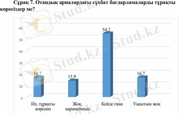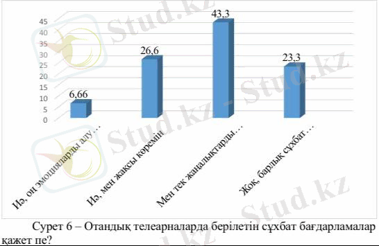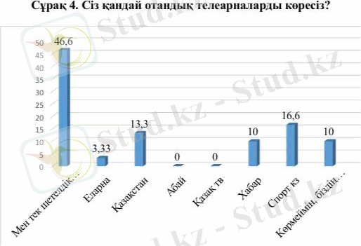«Сіз қандай отандық телеарналарды көресіз?» деген сұраққа 14 адам (46, 6%) «Мен тек шетелдік арналарды көремін», 1 адам (3, 33%) «Еларна», 4 адам (13, 3%) «Қазақстан», 3 адам (10%) «Хабар», 5 адам (16, 6%) «Спорт кз», 3 адам (10%) «Көрмеймін, біздің арналарға уақыт жетпейді» деп жауап берді. Бір де бір адам (0%) «Абай» және (0%) «Қазақ тв» арнасын көрмейтіндіктерін айтты.