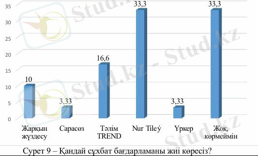 «Қандай сұхбат бағдарламаны жиі көресіз?» деген сұраққа 3 адам (10%) «Жарқын жүздесу», 1 адам (3, 33%) «Сарасөз», 5 адам (16, 6%) «Тәлім TREND», 10 адам (33, 3%) «Nur Tileý», 1 адам (3, 33%) «Үркер», 10 адам (33, 3%) «Жоқ, көрмеймін» деп жауап берді.