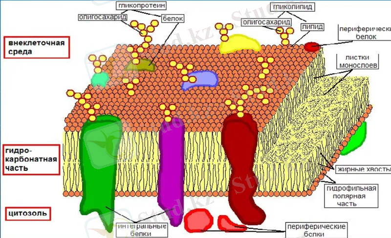 Жасушаның мембраналық компоненттері - липидтер мен белоктар. Липидтер: фосфолипидтер, фосфатидилэтханоламин, сфингомилин, фосфатидилинозитол және фосфатидилсерин, гликолипидтер. Липидтердің үлесі 40-90% құрайды. Ақуыздар: перифериялық, интеграл (гликопротеиндер), спектрин, актин, цитоскелет. Негізгі құрылымдық элемент фосфолипидті молекулалардың қос қабаты болып табылады. Мембрананың түрлері: жасушаның, эндоплазмалық тордың, лизосоманың, Гольджи аппаратының болып бөлінеді. Мембрана функциялары: