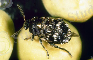Денесін тотық түсті түктер басқан қара қоңыз. Ұзындығы 4-5 мм. Мұртшалары 11 бунақты, алдыңғы бунақтары қызғылт. Алдыңғы арқасы өте жалпақ, көлденеңі ұзындығынан 2 есе артады. Үстіңгі қанаттарында ақшыл дақтар мен қиғаштау орналасқан ақ жолақтар бар. Құрсағының ең соңғы бунағы (пигидий) қанаттармен бүркелмеген, онда крест тәрізді ақ таңба болады. Личинкаларында аяқ болмайды, жуан денелі, ұзындығы 6 мм жетеді.