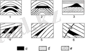 Гидравликалық ашық (1-3) және жабық (4-6) тұзақтардағы әртүрлі типтегі мұнай кен орындары: 1 - қабатты Мұнай және газ - мұнай кен орындары; 2 - жаппай жинақталған газ - мұнай кен орындары; 3-палеорельеф, бастапқы (мысалы. 4-стратиграфиялық келісіммен экрандалған мұнай шоғыры; 5 - коллектордың бастапқы (фациалдық, литологиялық) сыналану қақпағындағы мұнай шоғыры; 6 - тектоникалық экрандалған мұнай шоғыры; а - мұнай; б - газ; в-су.
