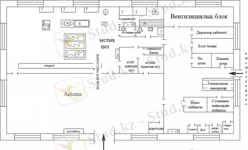 Бұл асханадағы ыдыстарда ас қорытуға кері әсер ететін зиянды, ащы заттар жоқ. Балаларға арналған тағамдарға арналған ассортимент. Балабақшада бес күндік жұмыс аптасы, балаларға 10 сағаттық демалыс. Балабақша тәрбиеленушілерінің контингентін 2, 5 жастан 7 жасқа дейінгі балалар қамтамасыз етеді. Мәзір 2 аптаға арналған. Ыдыс-аяқтарды дайындағанда технологиялық карталар, калориялар, өнімдер жиынтығы, ыдыс-аяқтың шығуы көрсетілген технологиялық карталар пайдаланылады. Балабақшаға баратын балаларға күніне 5 рет тамақ беріледі, таңғы ас, сонымен қатар кешкі ас, балаларға әр түрлі сүт жармасы, сорпа, көкөніс тағамдары, сүзбе ыдыс-аяқтары, кондитерлік өнімдер, какао, лимон қосылған шай, компот, шырындар, кешкі ас беріледі. Түскі ас, балық, ет қосылған бұқтырылған көкөністер, сүзбе асқабақтары.